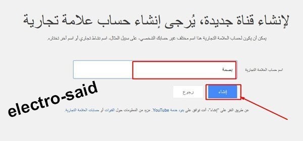 سوف يتم نقلك لصفحة أخرى لإنشاء حساب علامة تجارية (من أجل إنشاء قناة احترافية)، قم باختيار اسم الحساب الذي توده، والذي تريده أن يكون اسم قناتك على يوتيوب أيضاً، ثم اضغط إنشاء، كما هو موضح بالصورة بالأسفل.